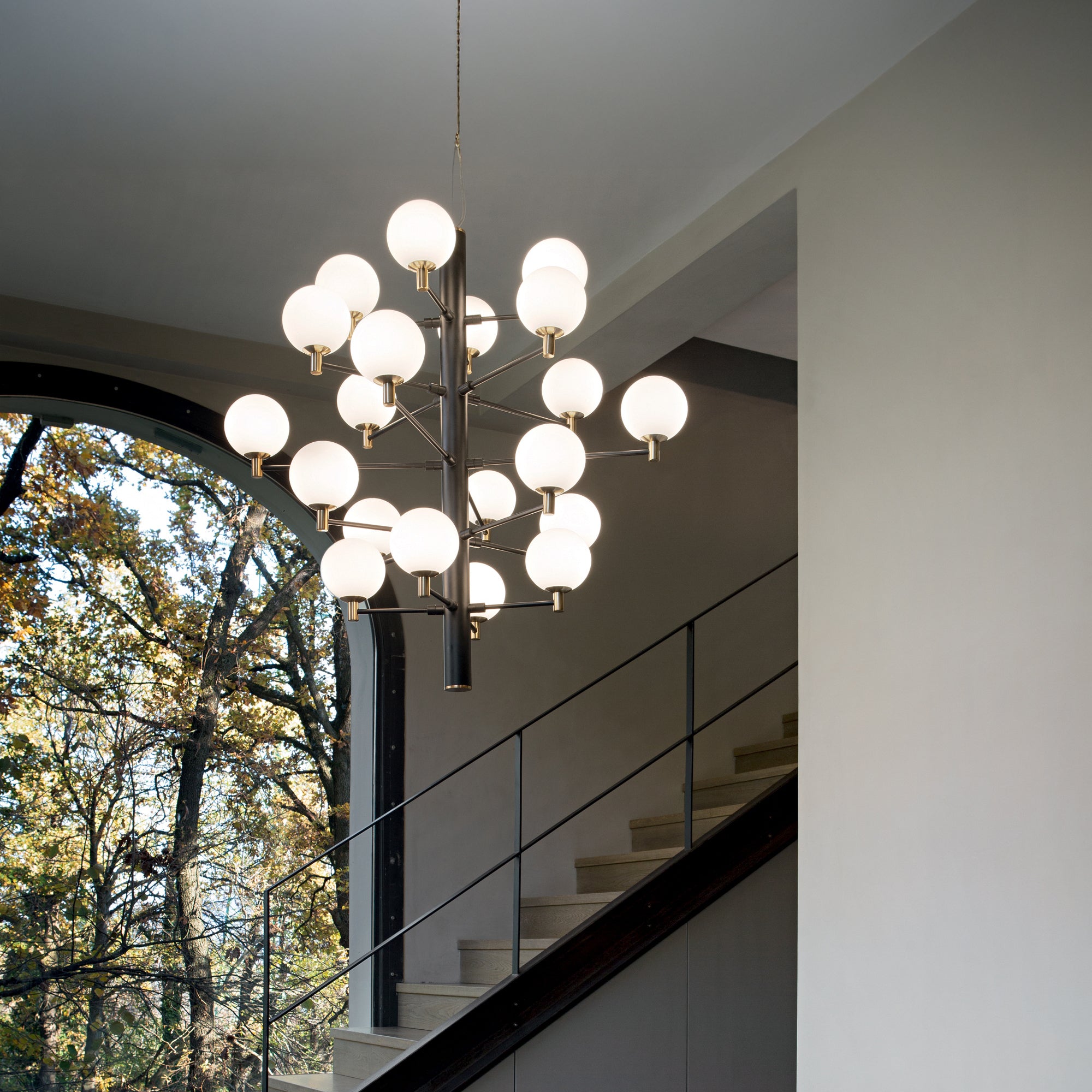 Oprawa dostępna jest z 12 lub 20 kloszami, co pozwala na dostosowanie natężenia i efektu świetlnego do konkretnej przestrzeni - od reprezentacyjnych wnętrz mieszkalnych po realizacje hotelowe czy komercyjne. Kontrast czarnej metalowej konstrukcji, złotych akcentów i opalowego szkła tworzy wyrafinowaną kompozycję, która prezentuje się luksusowo, zwiewnie i architektonicznie zarazem. Copernico staje się więc nie tylko źródłem oświetlenia, ale także dominującym elementem estetycznym przestrzeni.