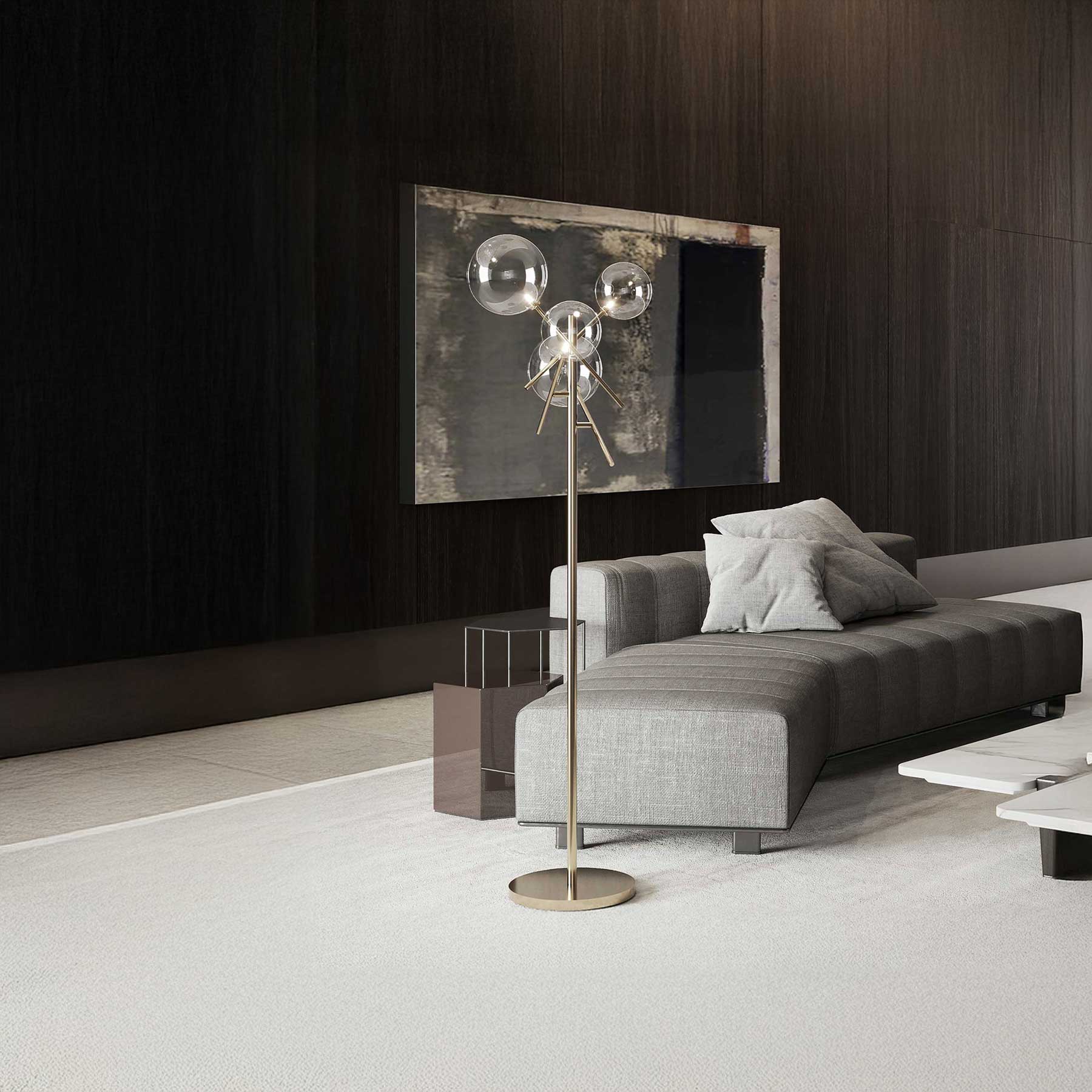 Stojací svítidlo Equinoxe od italské značky Ideal Lux představuje dokonalé spojení luxusního designu a funkční flexibility. Kovová konstrukce v provedení leštěný chrom nebo antik mosaz nese čtyři borosilikátové skleněné difuzory ve tvaru koulí, které mohou být čiré, kouřově šedé nebo jantarově zlaté. Díky promyšleným kovovým ramenům lze difuzory nastavovat do různých poloh a vytvářet tak dynamické světelné kompozice. Svítidlo je osazeno paticemi G4 a svým elegantním, ale univerzálním vzhledem se hodí jak do moderních, tak klasických interiérů, kde působí jako výrazný designový prvek i zdroj příjemného osvětlení.